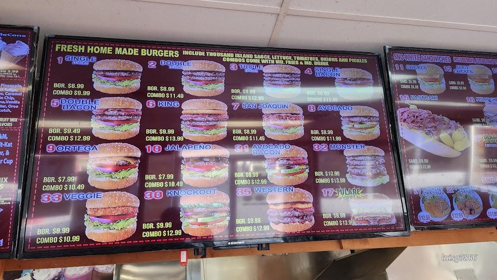 Welcome to Sno-White Drive In, located at 141 W Inyo Ave in Tulare, CA! Your go-to spot for delicious fast food, including mouthwatering hamburgers, crispy fries, and indulgent milkshakes. Open for breakfast, lunch, and dinner, we offer convenient takeout and delivery options in a relaxed atmosphere, perfect for families and solo diners alike. Enjoy accessible seating and parking while savoring our comforting dishes. Whether you're in the mood for a hearty meal or a quick snack, Sno-White Drive In is here to satisfy your cravings. Come visit us, and experience the friendly service and delightful flavors that keep our customers coming back!